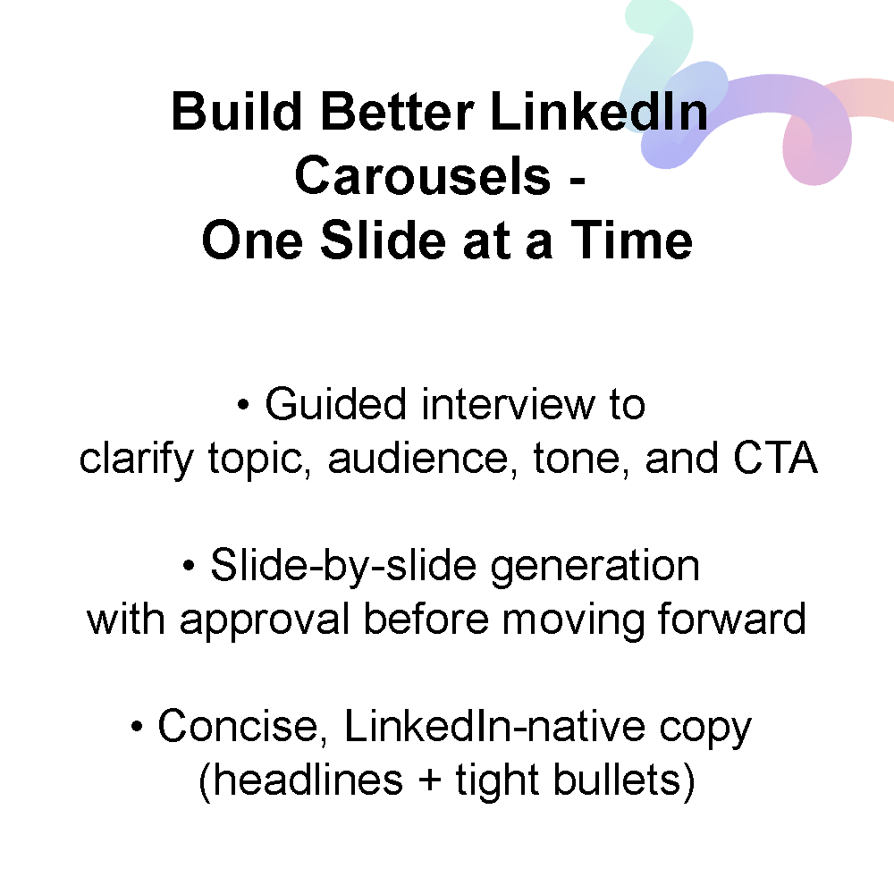 The core problem it solves is friction. Most people know what they want to say, but struggle to turn ideas into scannable slides that actually perform on LinkedIn. Carousel Architect removes that gap by applying proven carousel structure, concise writing, and visual consistency — so users can publish with confidence, not guesswork.