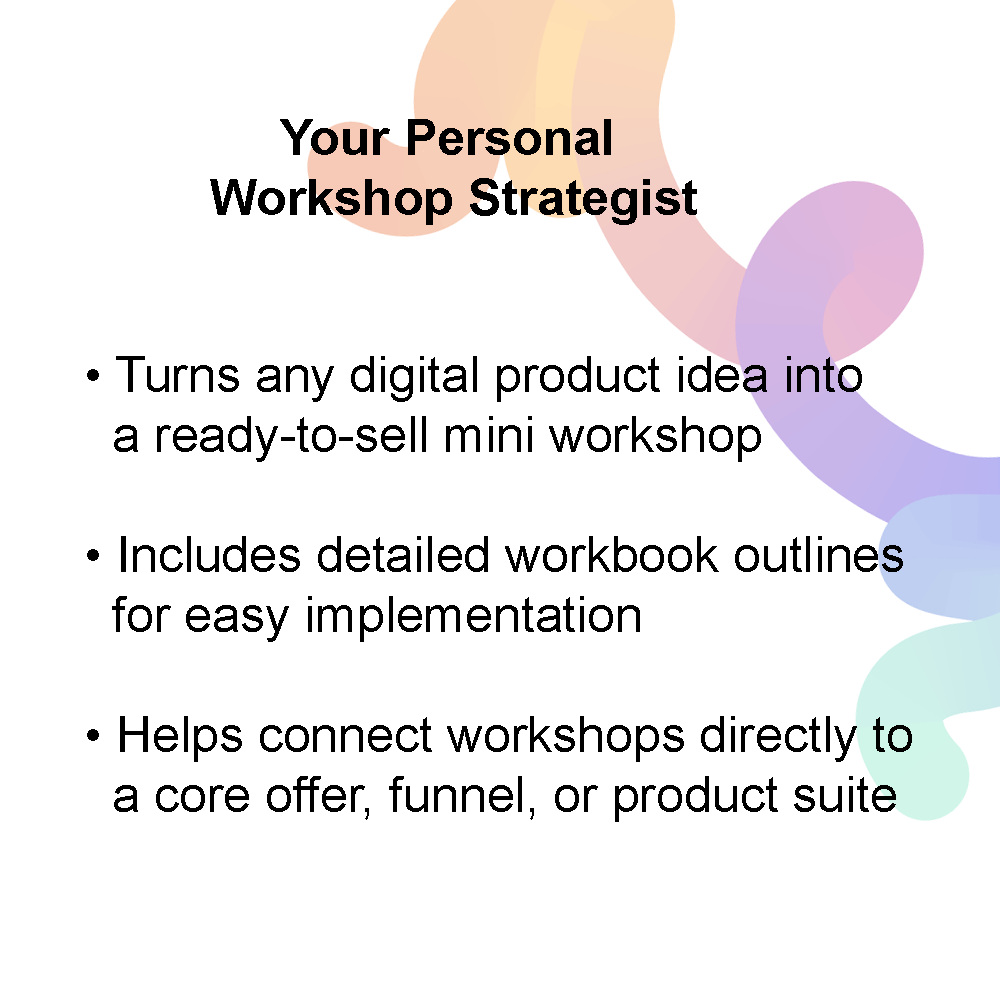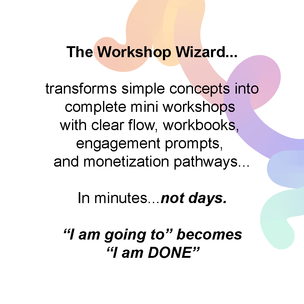 The Workshop Wizard solves the overwhelm that comes from trying to “do it all” yourself. Create your own monetizable min-workshops with your personal Workshop Strategist!